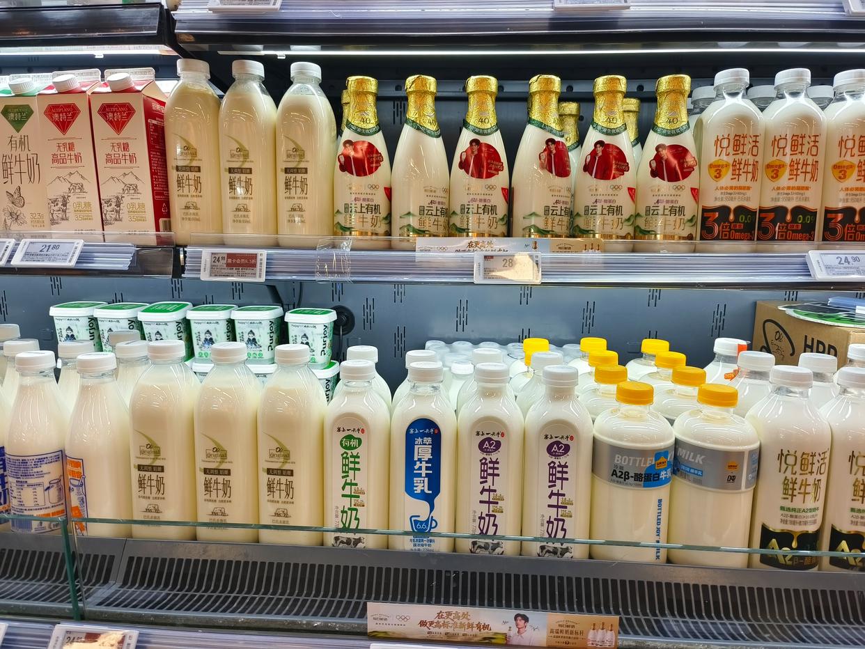 超市冷柜中摆放的各类牛奶