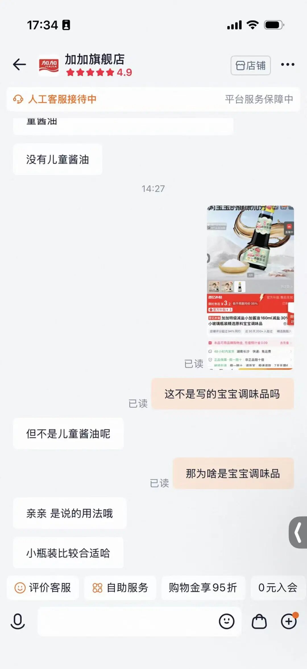 在小加酱油的电商平台宣传页面,记者看到多条诸如“宝妈首选”“宝宝调味品”“为宝宝的健康加分”等宣传语。记者询问平台客服“加加特级减盐小加酱油”是否为儿童酱油,客服回复称,这款不是儿童酱油。记者追问,既然不是儿童酱油,为何用称其为“宝宝调味品”,客服回答:“是说的用法,小瓶装比较适合(宝宝)。”