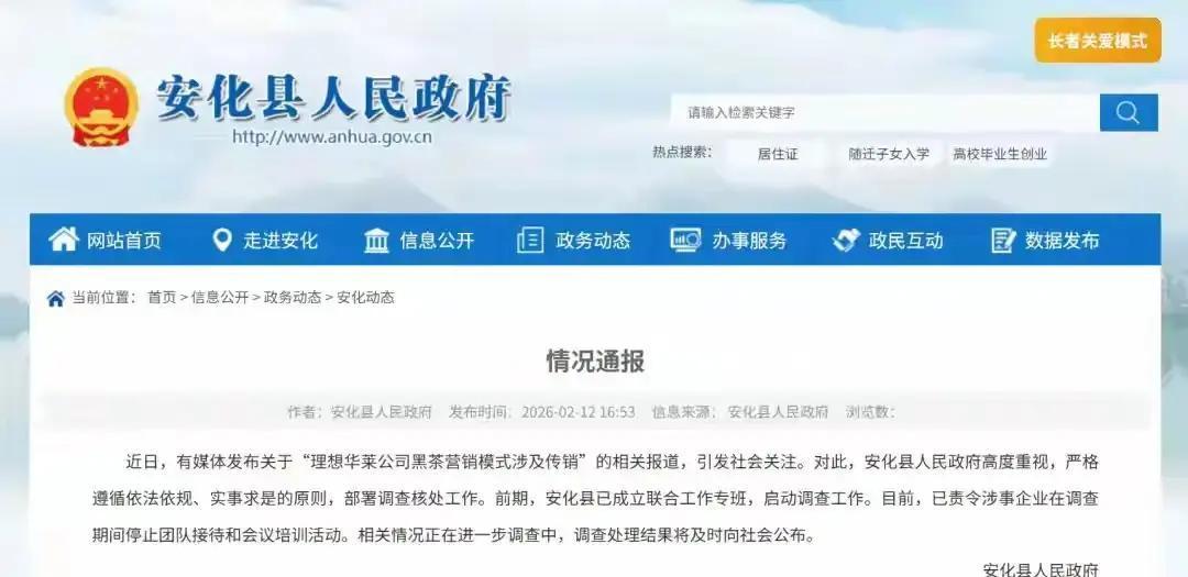 舆论的放大器发挥了作用。大象新闻的卧底报道播出后,人民日报也公开发声,直指要查清这张直销牌照是不是成了挡箭牌。最终,2月12日,湖南安化县政府下发通报,成立联合工作专班,要求对理想华莱的黑茶营销模式进行调查,并在调查期间责令停止团队接待和会议培训。