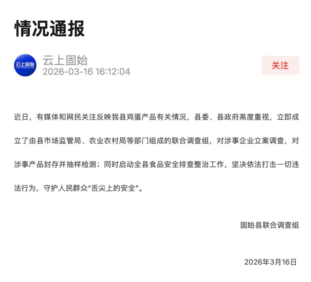 3月16日,固始县融媒体中心发布情况通报表示,固始县县市场监管局、农业农村局等部门已组成联合调查组,对涉事鸡蛋产品展开了立案调查。对涉事产品封存并抽样检测;同时启动全县食品安全排查整治工作,坚决依法打击一切违法行为。