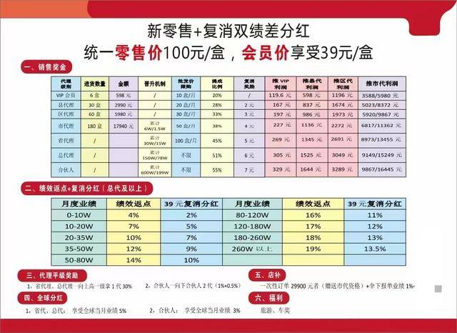 从上图可以看到,参与者购买6盒产品后可升级为VIP会员,此后通过累积消费可逐级晋升至县代、区代、市代、总代乃至合伙人,级别越高,参与者通过销售产品获得的提成比例越高。