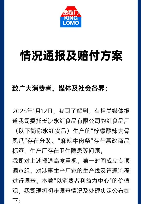就在门店回应各异的当天,金粒门通过关联公司湖南进化者食品有限公司发布官方通报,就代工厂问题致歉,并公布具体赔付及整改方案,试图平息舆论。
