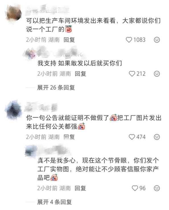 品牌方进一步表示:在发布“不作假”声明之后,我们将进一步推动信息公开与透明。例如,通过官方平台发布工厂实际生产环境的图片,让消费者更直观地了解产品从生产到门店的全过程,持续接受社会监督,共建安心、透明的消费环境。