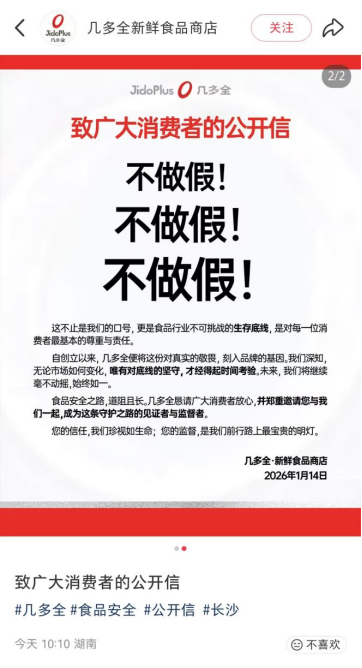 近日,某鲜食零食品牌被曝食品安全问题,引起网友热议。在此背景下,鲜食零售品牌“几多全”于1月14日通过社交平台发布《致广大消费者的公开信》,郑重承诺“不做假”,并表示食品安全是企业“不可挑战的生存底线”,呼吁消费者共同监督。
