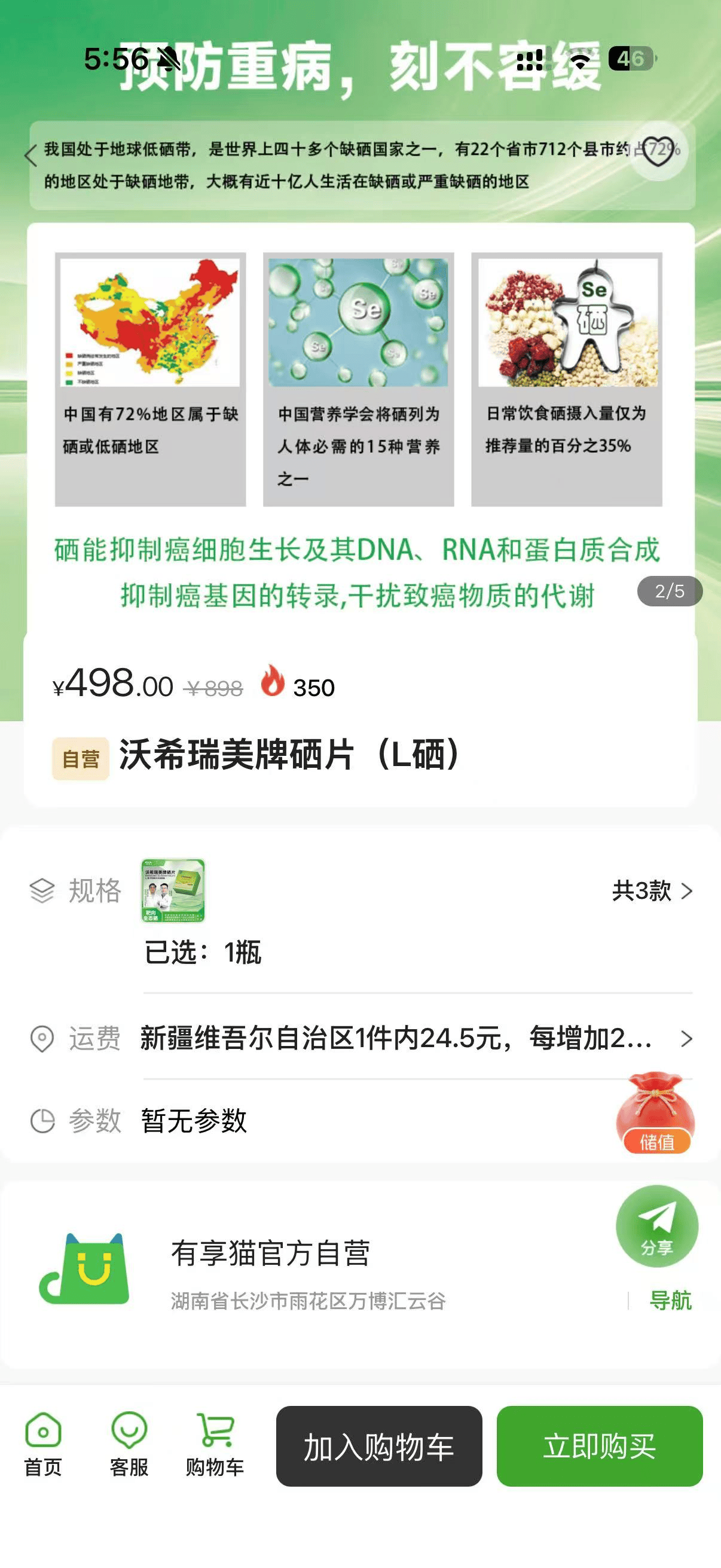 有享猫APP自营销售的“沃希瑞美牌硒片”页面。
