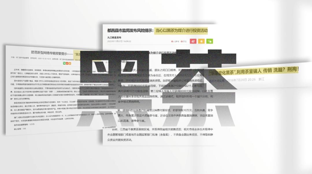 记者查询得知,全国多地市场监管部门曾发布以黑茶为媒介进行传销的风险提示。2025年12月15日、16日,宝鸡市政府官网、宝鸡市凤翔区人民政府官网先后发布《关于防范“理想华莱科技集团有限公司宝鸡代办点”涉嫌非法集资的风险提示》《关于转发防范“理想华莱科技集团有限公司宝鸡代办点”涉嫌非法集资的风险提示》。其中提到两名女性持有理想华莱科技集团有限公司营业执照和直销经营许可证复印件,推销茶叶获取高额提成,经金台区打非办组织区公安分局、区市场监督管理局、陈仓镇等相关部门人员上门排查,初步认定该代办点涉嫌非法集资或非法传销。