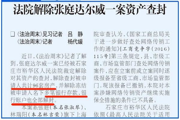 根据媒体报道,张庭旗下的达尔威涉传销一案的资产查封,已经被石家庄裕华区法院裁定解除,而解封的资产包括96套房产和多笔银行存款。...