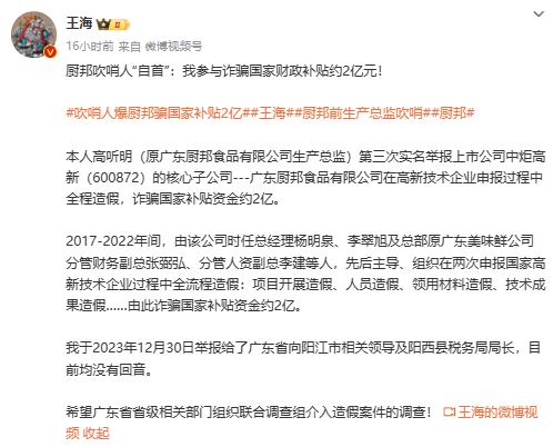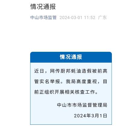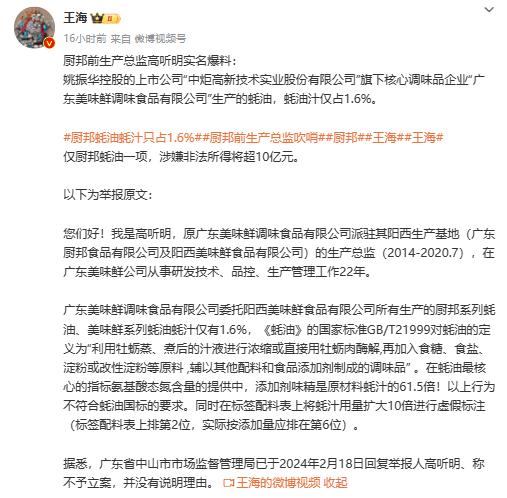 厨邦蚝油被前高管实名举报造假:蚝汁含量仅1.6%味精含量是蚝汁61.5倍 监管已介入 厨邦前高管实名爆料厨邦蚝油造假一事迎来新进展。据广东中山市市场监督管理局微信公众号3月1日发布的消息,就网传厨邦蚝油造假被前高管实名举报一事,中山市市场监督管理局高度重视,正组织开展相关核查工作。 ![]() 图源:中山市场监管微信公号截图 2月29日晚间,知名打假人王海在其微博贴出厨邦前生产总监高听明实名举报厨邦蚝油造假材料。高听明称,广东美味鲜调味食品有限公司委托阳西美味鲜食品有限公司所有生产的厨邦系列蚝油、美味鲜系列蚝油蚝汁仅有1.6%。蚝油中添加剂味精是原材料蚝汁的61.5倍,且标签配料表上将蚝汁用量扩大10倍进行虚假标注。 ![]() 图源:王海微博截图 此外,王海2月29日晚间的另一则微博贴出了一封高听明“自首信”。相关材料显示,2017-2022年间,广东厨邦食品有限公司时任总经理杨明泉、李翠旭及总部原广东美味鲜公司分管财务副总张弼弘、分管人资副总李建等人,先后主导、组织在两次申报国家高新技术企业过程中全流程造假,由此诈骗国家补贴资金约2亿。 ![]() 图源:王海微博截图 天眼查显示,广东美味鲜调味食品有限公司2000年6月成立,注册资本5亿元人民币,公司法定代表人为余向阳,经营范围含食品生产、销售等。天眼查股东信息显示,该公司由中炬高新技术实业(集团)股份有限公司和中山创新科技发展有限公司共同出资成立,两者分别持股75%和25%。 天眼查显示,广东厨邦食品有限公司2012年4月成立,注册资本1亿元人民币,公司法定代表人为余向阳,经营范围含食品生产、货物及技术进出口等。天眼查股东信息显示,该公司由广东美味鲜调味食品有限公司及北京朗天慧德企业管理有限公司共同出资成立,两者分别持股80%和20%。中炬高新技术实业(集团)股份有限公司间接持有该公司约80%股份。 公开资料显示,中炬高新技术实业(集团)股份有限公司主营业务是调味食品、园区运营及城市开发,公司1993年1月成立,1995年1月成功上市。中炬高新(SH:600872)此前发布的2023年三季报显示,公司前三季度共实现营收39.53亿元,其中美味鲜公司1-9月实现营业收入37.90亿元。 (责任编辑:夏石福) |