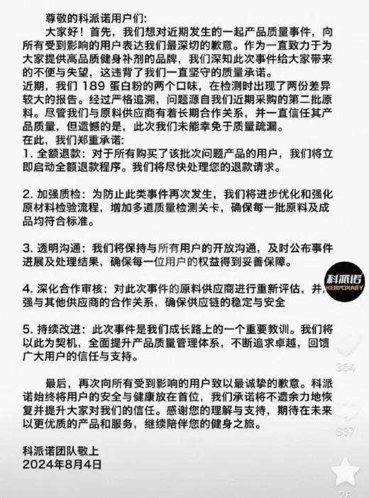 “小时候躲过了三鹿奶粉,长大后没躲过科派诺的蛋白粉。”这是健身圈最近流传的一句段子。 ![]() 近日,运动营养品牌科派诺的蛋白粉被曝出食品安全问题,大量消费者在黑猫投诉平台曝光称,在科派诺运动营养旗舰店购买的189元蛋白粉中甘氨酸含量异常超标,每100克中添加量高达10克,远超正常标准。过量摄入甘氨酸可能增加肾脏负担,影响必需氨基酸生成,导致营养失衡,危害消费者健康。 蓝鲸新闻记者对相关事件进行了深入调查。 ![]() 甘氨酸含量超标数倍? 科派诺蛋白粉遭批量退货 小蓝是一名在校大学生,从今年夏天开始他决定健身增肌,便在某平台上购买了一罐科派诺的乳清蛋白粉,然而在食用了几个星期之后他发现,该蛋白粉中甘氨酸含量异常的高,于是决定退款。 ![]() 据他描述:“之所以会买这款蛋白粉是因为便宜。大学生生活费真的很少,一桶蛋白粉三五百,对于我们来说是笔不小的开支,所以我们更倾向选择一桶不到200元的科派诺。”记者了解到,购买这款蛋白粉的消费群体基本以大学生为主,购买的原因也很简单,一是产品便宜,二是某健身博主的推荐。 ![]() 今年7月,健身博主贾博钧代理销售了一款名为科派诺的蛋白粉。为了证明自己代言的安全性,博主公开晒出了一张权威机构的检测报告,谁料这一证明反而让自己翻了车。 据报告显示,蛋白粉中每百克甘氨酸含量达到了10.2克。(正常在每100克含量1克)值得注意的是,这一数据远远高出一般的蛋白粉的甘氨酸含量。 ![]() 由于代销的蛋白粉存在产品质量问题,一时间贾博钧遭到圈内人士的讨伐,众多购买了该产品的消费者纷纷发起退款。 8月4日,科派诺发文致歉称:“蛋白粉检测出现问题原因在于采购的原料,尽管与原料供应商存在长期合作问题,但未能幸免于质量疏漏,公司将对购买该批次产品的用户全额退款。”随后,贾博钧也对此事进行了公开致歉。目前,双方的致歉信均已被删除。 ![]() 记者查询发现,该蛋白粉已经在全网下架,虽然目前一些消费者完成了退货退款,但作为一款每日都要食用的运动营养品,不少消费者还是对此心有余悸。例如,为什么科派诺的蛋白粉甘氨酸会超标?过量食用是否真的有害?价格便宜背后究竟暗藏了怎样的猫腻? ![]() 健身圈的“三鹿奶粉”? 厂商为降低成本超标使用甘氨酸 大学生为主要消费者 蓝鲸新闻记者通过科派诺的官方店铺查询发现,其关联公司为盈轩(山东)药业科技有限公司,该公司成立于2019年7月,成立至今仅5年时间,法定代表人为王金童,注册资本1000万。 经营范围包含中成药、中药饮片研发、保健食品、食用农产品、营养健康咨询等。 ![]() 数据显示,科派诺在抖音线上30天累计销售额近500万元,在被曝出质量问题后,该品牌日销售额暴降90%。 ![]() 作为一个运动营养品牌,圈外人或许不熟悉科派诺,但对于健身圈的人来说这个品牌并不陌生,尤其是大学生群体。 健身教练季川对蓝鲸新闻记者透露:“一般预算充足的话都不会买科派诺这种小牌子。我们健身增肌都会选择康比特、训练怪兽这种一线品牌,一罐400多元,对比之下科派诺才不到200元一罐。” 季川表示,科派诺的受众人群以消费能力弱的大学生为主,那些所谓的健身博主为了带货吸引学生买,不惜拉踩其他品牌,说别人存在品牌溢价。实际上蛋白粉这个东西一分价钱一分货,贵有贵的道理,便宜的东西大概率会在原材料成本中做手脚。 记者调查了多款蛋白粉发现,一线品牌的蛋白粉甘氨酸含量都在每100克里1g左右,超过2g都极其少见。如果蛋白粉中甘氨酸达到每100克里10克,那么大概率是添加了过量的甘氨酸。 根据《中华人民共和国国家标准食品添加剂使用标准》(GB2670-2014),甘氨酸最大使用量为3克/千克,且使用范围为预制肉制品等,而科派诺蛋白粉甘氨酸含量为10克/100克,该含量远超过甘氨酸允许使用的最大使用量3克/千克。 另据《中华人民共和国食品安全法》第三十四条“禁止生产经营下列食品、食品添加剂、食品相关产品:(四)超范围、超限量使用食品添加剂的食品”的规定,因此,科派诺蛋白粉属于超范围、超限量使用食品添加剂甘氨酸。 ![]() 作为补剂厂商为什么要添加过量的甘氨酸呢? 季川继续解释称:“构成人体蛋白质的氨基酸主要有20种,有些厂商为了提高蛋白粉中的蛋白质含量标准,通常会添加便宜的氨基酸来达到目的,比如每公斤十几块的甘氨酸,这样可以实现在产品成分表上蛋白质含量的虚高,从而吸引消费者购买。” 简单的说就是,甘氨酸成本低,又能提高蛋白质含量标准,所以成本低了,蛋白粉的售价自然就能比别人更低。 事实上,厂家的这一操作和当年“三鹿奶粉”事件原理如出一辙,都是通过在奶粉/蛋白粉中添加廉价原料来实现虚高的蛋白质标准。只不过当时奶粉中添加的是工业原料三聚氰胺,而如今蛋白粉中添加的是人体非必要氨基酸甘氨酸。 ![]() 过量食用甘氨酸是否有害? 关于甘氨酸的问题,蓝鲸新闻记者咨询了营养师和三甲医院的医生。 营养师称:“甘氨酸是人体非必要氨基酸,此类氨基酸是在人体可以合成的。营养学中长期食用非必要氨基酸会破坏正常的蛋白质合成吸收,从生理角度讲增加肝肾代谢功能负担,长期超标摄入干扰体内代谢生理功能调节。” 简单地说就是,人体对氨基酸的吸收有上限,如果把某一个非必需氨基酸吃多了,就会影响和抢占到其他必须
