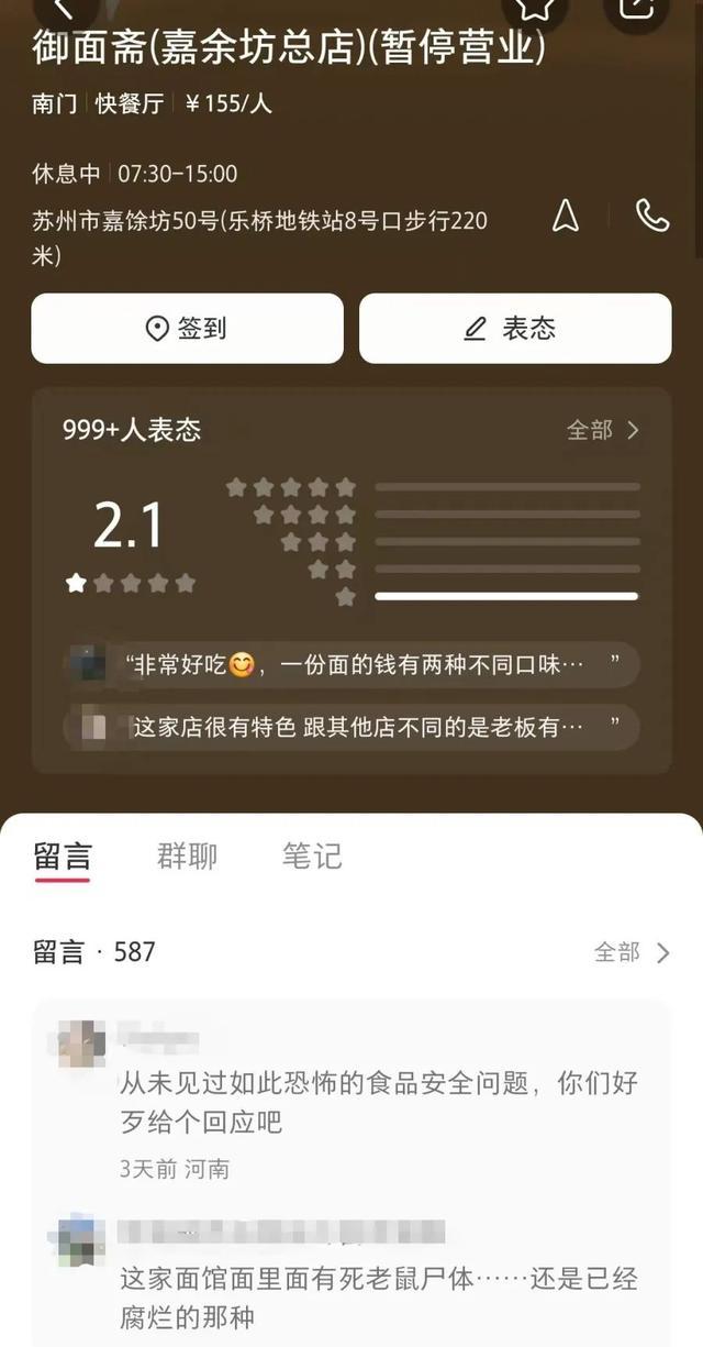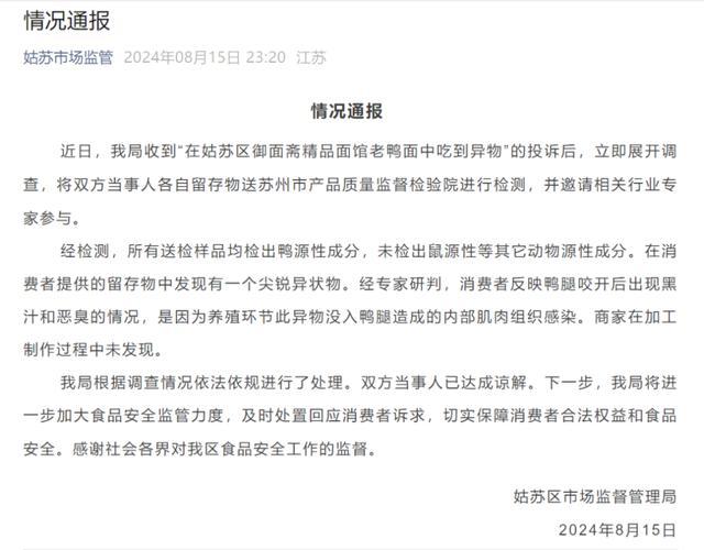 苏州166元老鸭面中疑似吃出“腐鼠”?官方通报